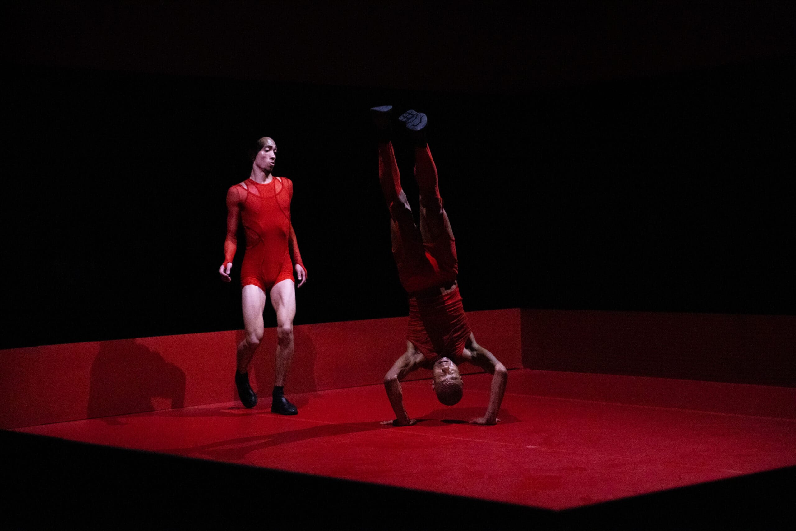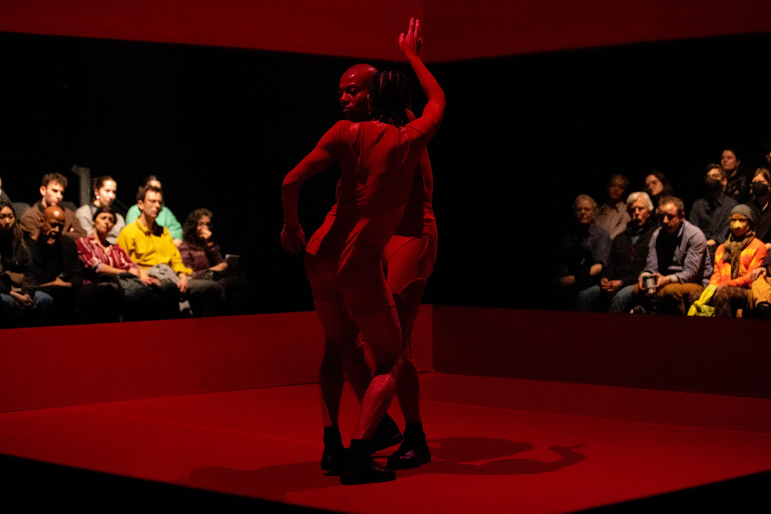 Touch of RED is a new evening-length multidisciplinary performance work consisting of a duet for two men inside a contemporary ring. Drawing inspiration from two distinct arts requiring rapid-fire footwork – boxing and the African-American jazz dance style Lindy Hop – this ten-round duet is performed by Pitts and Tushrik Fredericks who debuted with the Afrofuturistic collective in the critically-acclaimed 2022 show BLACK HOLE: Trilogy and Triathlon. Set in a stylized ring designed by the 2015 McArthur Fellow Mimi Lien and featuring cinematic video mapping by Lucca Del Carlo, lighting by the veteran Australian designer Rus Snelling, and costumes by the acclaimed experimental fashion star Dion Lee, Touch of RED examines the way Black men are perceived and perceive themselves in contemporary society and how masculinity and vulnerability can be reconciled in a non-competitive, compassionate, and healing way.