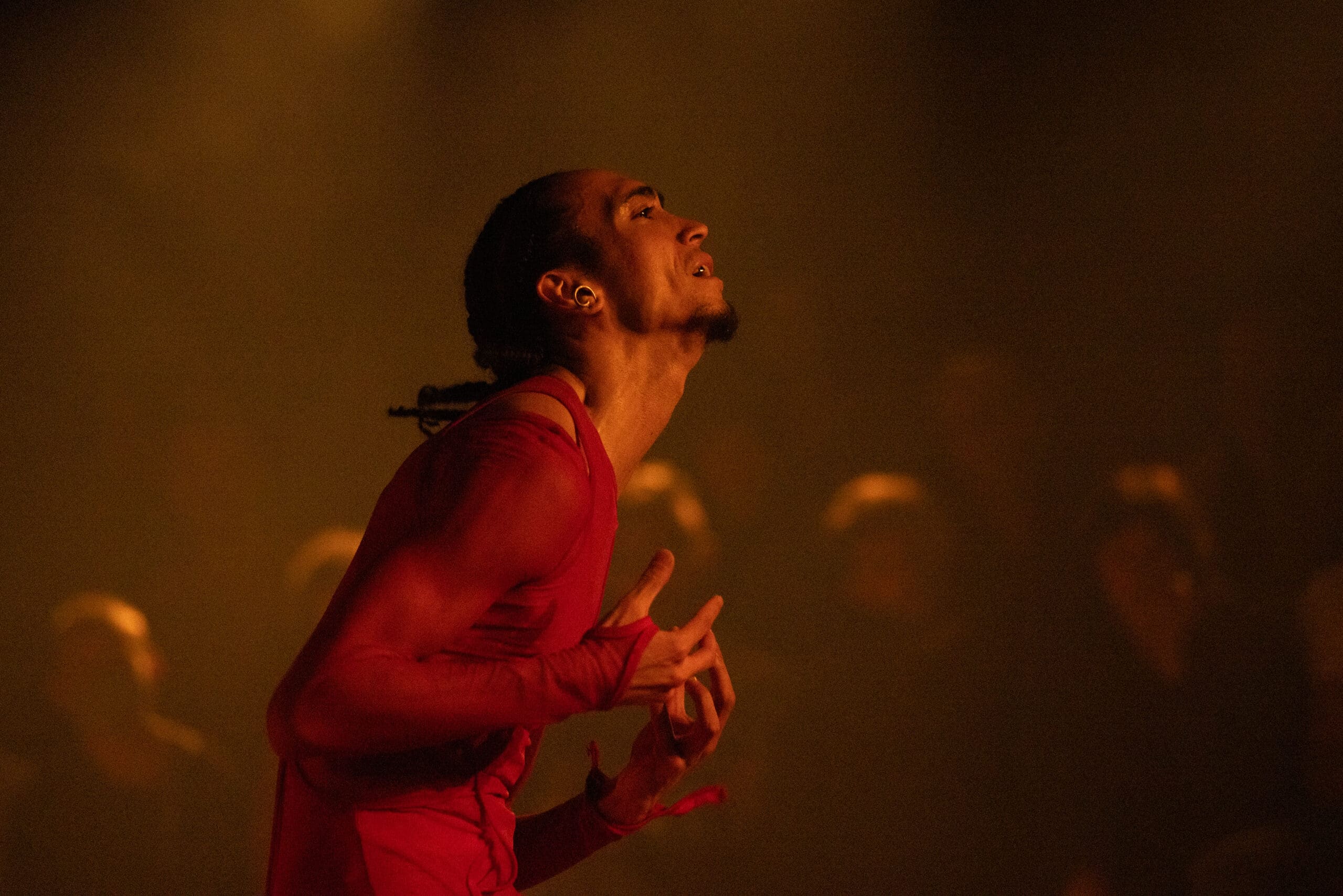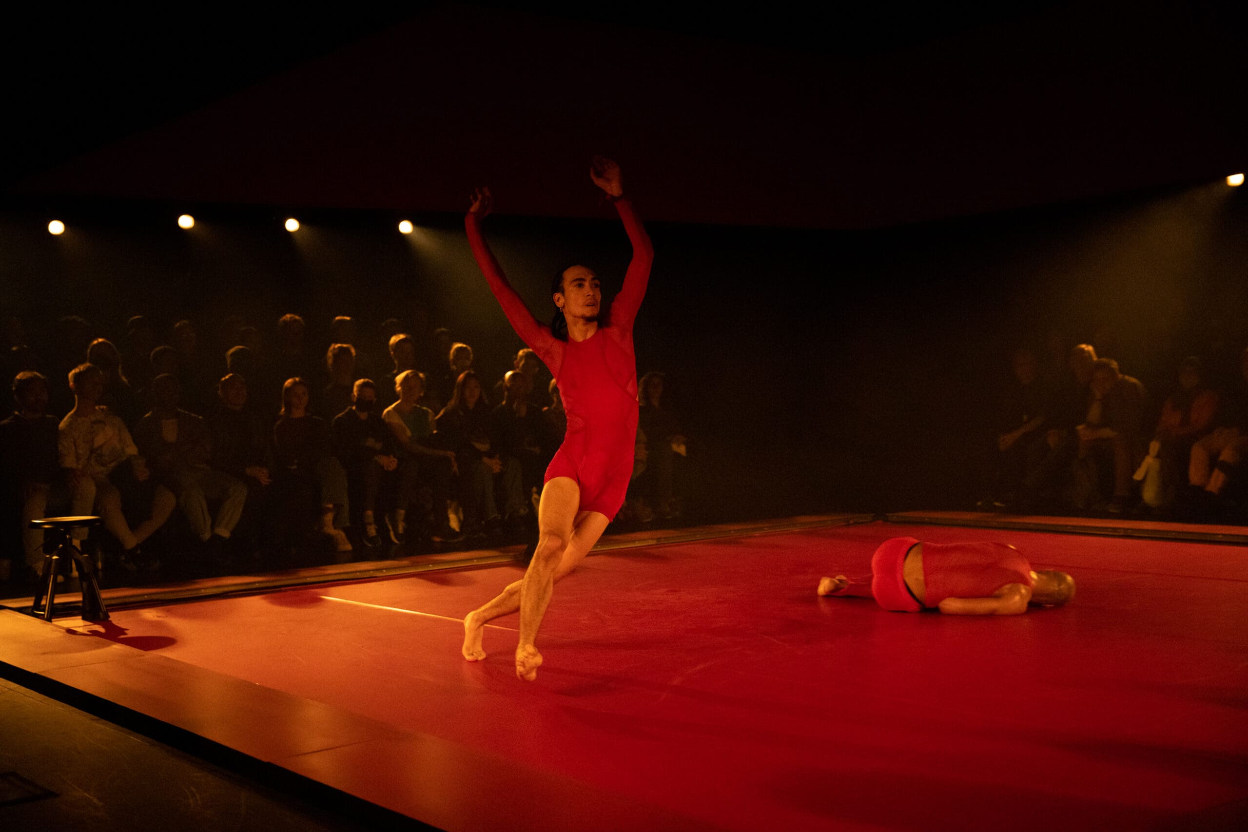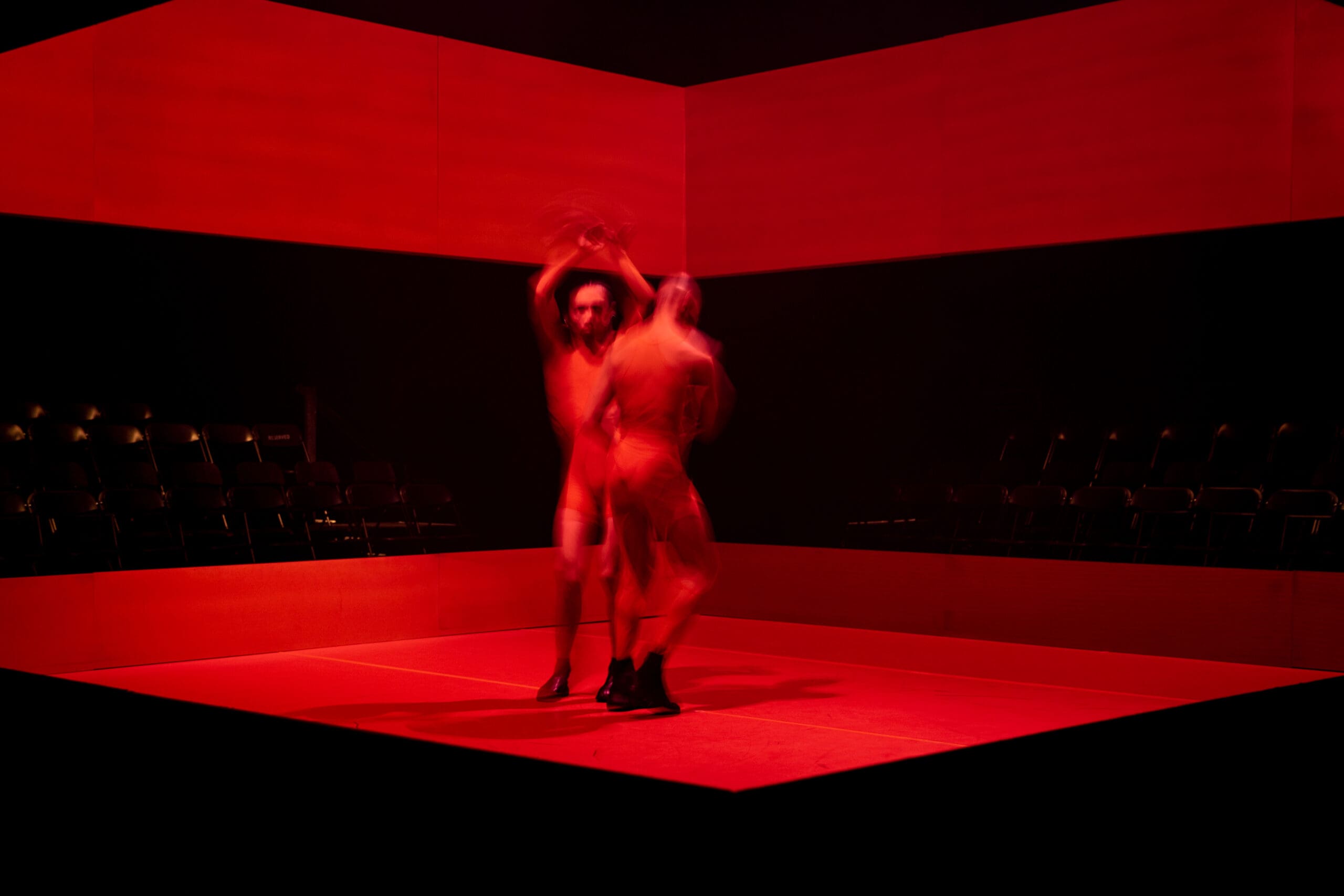 Touch of RED is a new evening-length multidisciplinary performance work consisting of a duet for two men inside a contemporary ring. Drawing inspiration from two distinct arts requiring rapid-fire footwork – boxing and the African-American jazz dance style Lindy Hop – this ten-round duet is performed by Pitts and Tushrik Fredericks who debuted with the Afrofuturistic collective in the critically-acclaimed 2022 show BLACK HOLE: Trilogy and Triathlon. Set in a stylized ring designed by the 2015 McArthur Fellow Mimi Lien and featuring cinematic video mapping by Lucca Del Carlo, lighting by the veteran Australian designer Rus Snelling, and costumes by the acclaimed experimental fashion star Dion Lee, Touch of RED examines the way Black men are perceived and perceive themselves in contemporary society and how masculinity and vulnerability can be reconciled in a non-competitive, compassionate, and healing way.